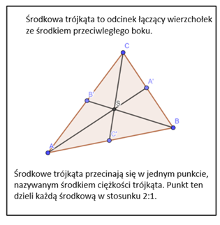 W tym zadaniu należy przeczytać informacje w ramce, a następnie obliczyć współrzędne środka ciężkości trójkąta o wierzchołkach
