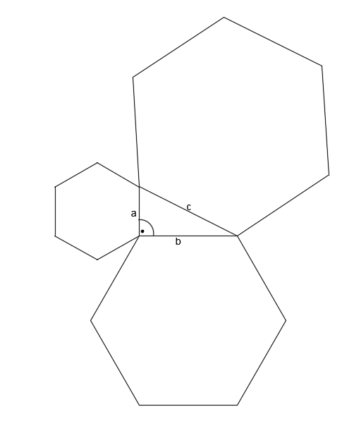 Udowodnij, że w trójkącie prostokątnym pole sześciokąta foremnego zbudowane na przeciwprostokątnej jest równe sumie pól sześciokątów foremnych zbudowanych na przyprostokątnych.