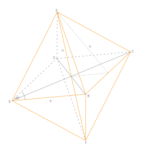 Dany jest ośmiościan ABCDEF złożony z dwóch ostrosłupów prostych. Figury ABCD i BFDE są rombami ich kąt ostry wynosi 60° a bok a. Przekątne AC i EF są prostopadłe. Określ jaką figurą jest czworokąt AFCE.