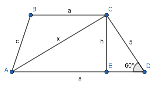 Wyznacz promień okręgu, jeśli jedno z ramion trapezu ma długość 5 i jest nachylone do dłuższej podstawy pod kątem