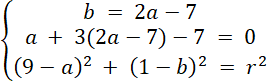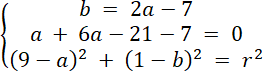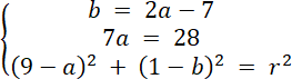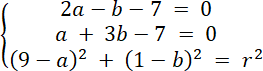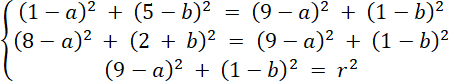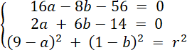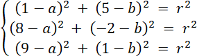 Rozwiąż układ równań z trzema równaniami, każde z nich powstało w wyniku podstawienia współrzędnych danych punktów do wzoru równania okręgu. Oblicz wartości niewiadomych, a następnie zapisz równanie okręgu.