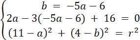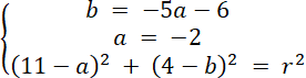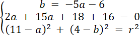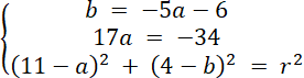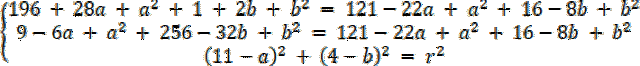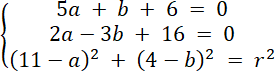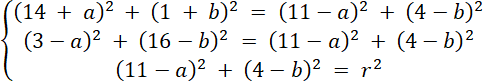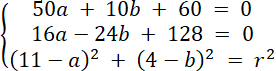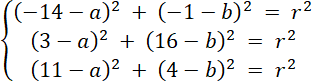 Rozwiąż układ równań z trzema równaniami, każde z nich powstało w wyniku podstawienia współrzędnych danych punktów do wzoru równania okręgu. Oblicz wartości niewiadomych, a następnie zapisz równanie okręgu.