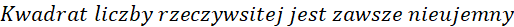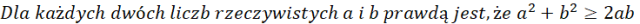 W rozwiązaniu zaprezentowałem dwa rozwiązania. I sposób polega na tradycyjnym przeniesieniu wszystkich wyrazów na jedną stroną, w naszym przypadku na prawą i zauważaniu, że jest to wzór skróconego mnożenia, kwadrat różnicy. Kwadrat dowolnej liczby rzeczywistej jest zawsze większy bądź równy 0, zatem ostatnia nierówność jest prawdziwa, a zatem i początkową, gdyż są sobie równoważne. Drugi sposób wykorzystuje tak zwane średnie matematyczne, a dokładnie średnią arytmetyczną i geometryczną dwóch liczb większych bądź równych 0. Podstawiając