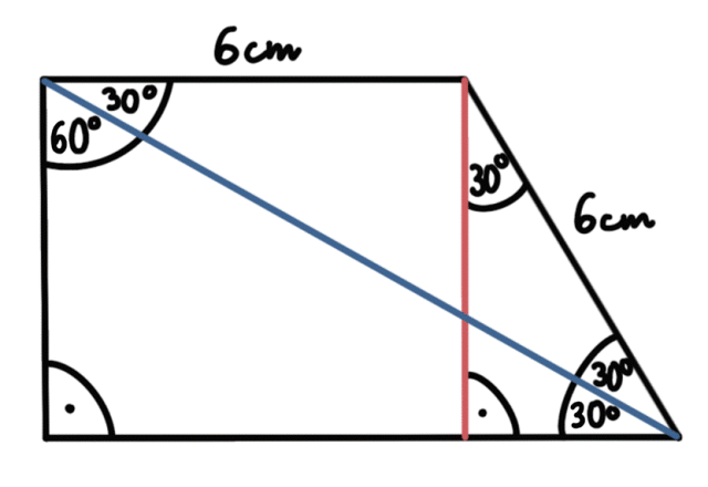 . Przekątna dzieli ten kąt na pół, co oznacza, że z dłuższą podstawą tworzy trójkąt prostokątny
