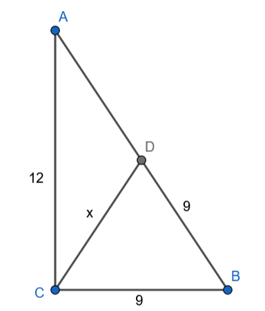 Wyznacz cosinus kąta BCD, promień okręgu wpisanego w trójkąt BCD i promień okręgu opisanego na tym trójkącie, jeśli w trójkącie prostokątnym ABC przyprostokątne AC i BC mają długości odpowiednio 12 i 9. Na boku AB wybrano taki punkt D, że odcinki BC i BD są równe.