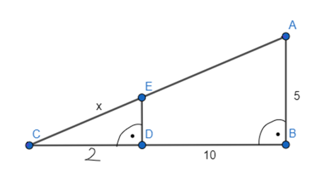 Wykonaj rysunek pomocniczy i przyjmij oznaczenia jak na powyższym, rysunku. Wiadomo, że trójkąty ABC i EDC są podobne z cechy kkk, ponieważ są prostokątne i mają wspólny kąt przy wierzchołku C. Skorzystaj z twierdzenia Pitagorasa, aby wyznaczyć długość b. Następnie wyznacz długość x.