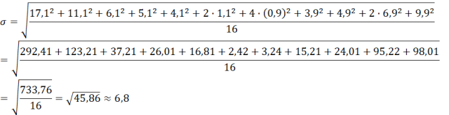 Odchylenie standardowe mierzy poziom rozproszenia danych. Tam, gdzie dane są stosunkowo bliskie sobie, odchylenie standardowe będzie niskie. Obliczamy je, sumując kwadraty wszystkich danych i dzieląc tę wartość przez ich ilość, a następnie odejmujemy od tej liczby kwadrat wartości średniej arytmetycznej tych liczb i pierwiastkujemy.