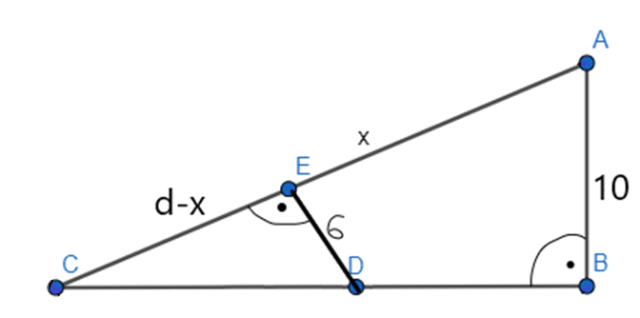 Wykonaj rysunek pomocniczy i przyjmij oznaczenia jak na powyższym, rysunku. Wiadomo, że trójkąty ABC i EDC są podobne z cechy kkk, ponieważ są prostokątne i mają wspólny kąt przy wierzchołku C. Skorzystaj z twierdzenia Pitagorasa, aby wyznaczyć długość d. Następnie wyznacz długość x.