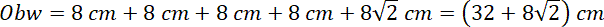 Długość dłuższego ramienia jest taka sama jak długość krótszej przekątnej – znowu masz trójkąt prostokątny równoramienny. Możesz obliczyć obwód: