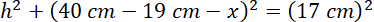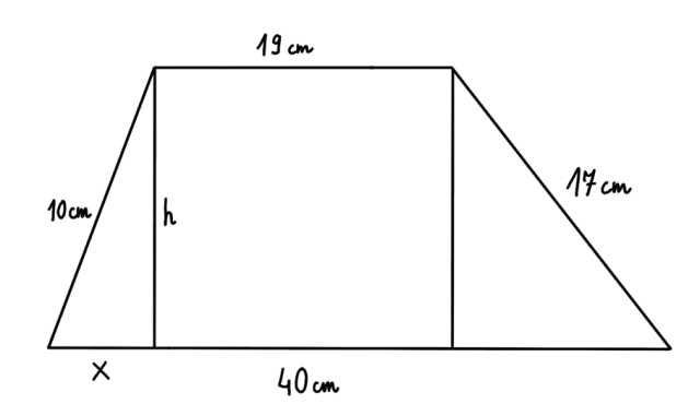Podstawy wynoszą 19 cm i 40 cm, a ramiona są równe 17 cm i 10 cm. Aby obliczyć pole trapezu, musisz obliczyć wysokość. Skorzystaj z twierdzenia Pitagorasa dla obu ramion. Oznacz wysokość jako h, odcinek dłuższej podstawy od końca do punktu, w którym opada wysokość jako x.