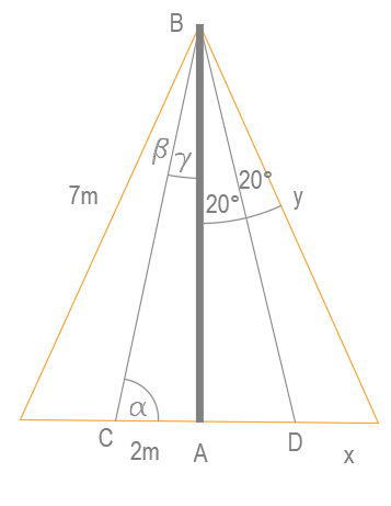 Znajdź długości odcinków i miary kątów zaznaczonych na rysunku, jeśli podtrzymywany 4 linami maszt ma wysokość 5 m.