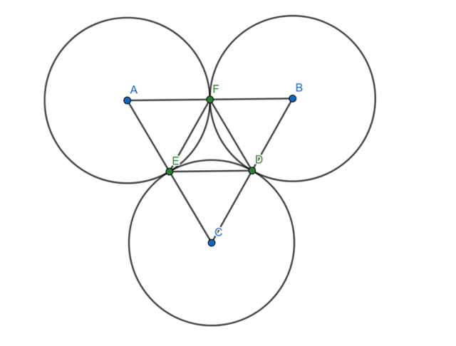 Trzy okręgi o promieniu r są styczne zewnętrznie, każdy do dwóch pozostałych. W tym zadaniu musisz wyznaczyć długości boków i miary kątów trójkąta, utworzonego przez punkty styczności.