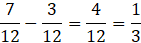 Aby znaleźć różnicę dwóch ułamków o tych samych mianownikach, odejmij liczniki, a mianownik pozostaw bez zmian. Jeśli liczby są mieszane, to odejmij od siebie części całkowite i części ułamkowe odejmij w taki sam sposób. Pamiętaj o zamienianiu ułamków na nieskracalne.