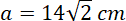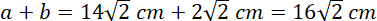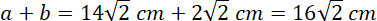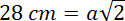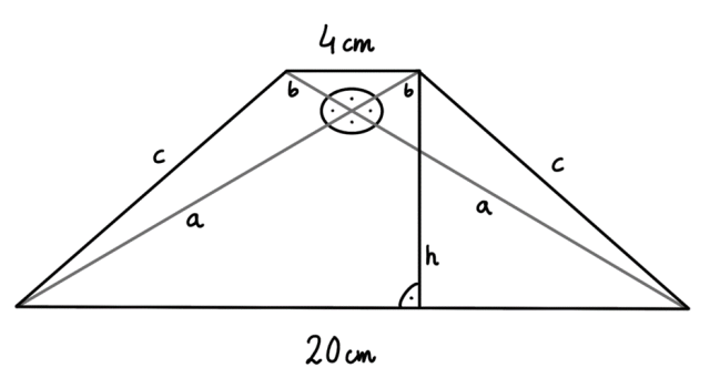 Przekątne trapezu równoramiennego przecinają się pod kątem prostym, mają one taką samą długość. Podstawy są równe 4 cm i 28 cm. Przekątne tworzą z podstawami dwa trójkąty równoramienne prostokątne, których podstawami są podstawy trapezu. Oblicz długość przekątnej:
