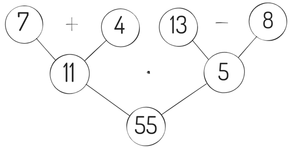 Obliczenia na drzewkach wykonuj od góry do dołu, w taki sposobu, że operacje matematyczną zapisaną pomiędzy kółeczkami wykonujesz na liczbach w tych kółkach, a wynik piszemy w kółeczku pod spodem. Liczba w kółeczku na samym dole to wynik działania.