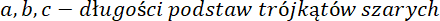 Zapisz pole trójkątów niebieskich i szarych za pomocą długości podstaw oraz wspólnej wysokości. Zauważ, że po odjęciu odpowiednich białych pól, możesz zapisać wyrażenia oraz zachodzi równość między długościami podstaw trójkąta