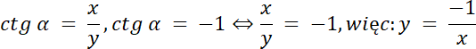 W tym zadaniu skorzystaj ze wzoru na ctg α, aby wyznaczyć warunki dla punktu P, przyrównaj liczniki ułamków oraz mianowniki, a następnie narysuj prostą o równaniu y = –1/x w układzie współrzędnych i zaznacz na niej punkt P, gdzie pierwsze ramię leży na dodatniej osi OX, a drugie odpowiednio dla punktu P, czyli w IV ćwiartce układu współrzędnych, ponieważ α ⋲ (270°, 360°).