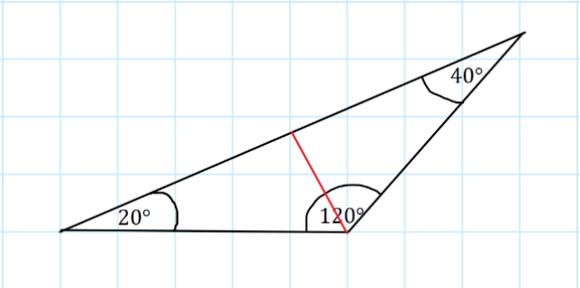 Kąty wewnętrze tego trójkąta są równe: 180˚ - 160˚ = 20˚, 180˚ - 60˚ = 120˚, 180˚ - 120˚ - 20˚ = 40˚.