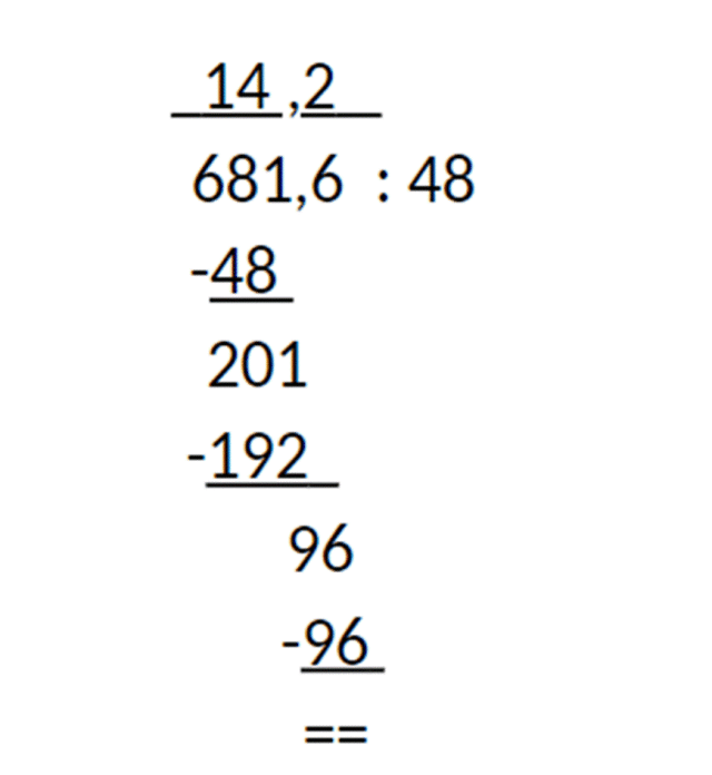 Pamiętaj, iloraz dwóch liczb o tym samym znaku jest liczbą dodatnią. Przesuń przecinki w prawo tak, aby dzielnik był liczbą całkowitą i zapisz te liczby obok siebie. Zapisz, ile razy w liczbie 68 mieści się cała liczba 48, a następnie odejmij od niej iloczyn liczby 48 i wpisanej liczby. Dopisz na końcu wyliczonej różnicy kolejną cyfrę z dzielnej i postępuj identycznie z otrzymanymi wynikami, aż do końca liczby. Przepisz przecinek w tym samym miejscu, w którym stał w dzielnej.
