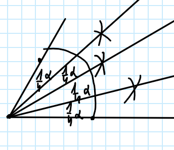 Skonstruuj dwusieczną kąta alfa, a następnie dwusieczne powstałych dwóch kątów, miara jednego z czterech kątów będzie 4 razy mniejsza od miary kąta alfa.
