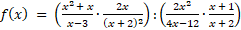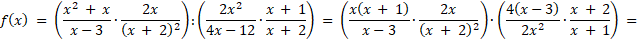 Wyznacz dziedzinę tej funkcji wiedząc, że wyrażenia z mianownika muszą być różne od zera. Uprość funkcję zamieniając dzielenie na mnożenie przez odwrotność, wyłącz wspólne czynniki przed nawias i skróć to, co się da.