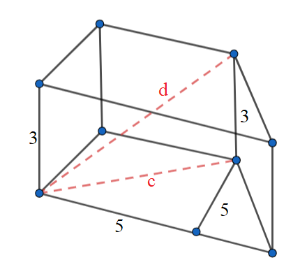 Oblicz długość krótszej przekątnej bryły d. Skorzystaj z twierdzenia Pitagorasa a2 + b2 = c2, gdzie a i b to długości przyprostokątnych, a c to przeciwprostokątna trójkąta prostokątnego.