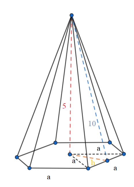 W tym zadaniu oblicz długość krawędzi podstawy ostrosłupa prawidłowego sześciokątnego wiedząc, że jego wysokość jest równa 5, a wysokość jego ściany bocznej wynosi 10.