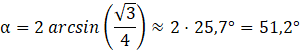 Oblicz długości boków trójkąta utworzonego przez zaznaczone odcinki. Wykorzystaj równoramienność powstałego trójkąta, by obliczyć miarę kąta α. Skorzystaj z tablic wartości funkcji trygonometrycznych lub kalkulatora.