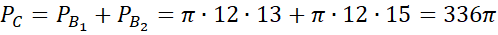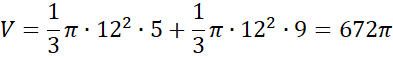Na podstawie twierdzenia Pitagorasa wyznacz wysokość obu stożków, a następnie oblicz objętość powstałej bryły, czyli dwóch stożków o wyznaczonych długościach promieni i wysokościach, a następnie pole całkowite, czyli sumę pól bocznych obu stożków.