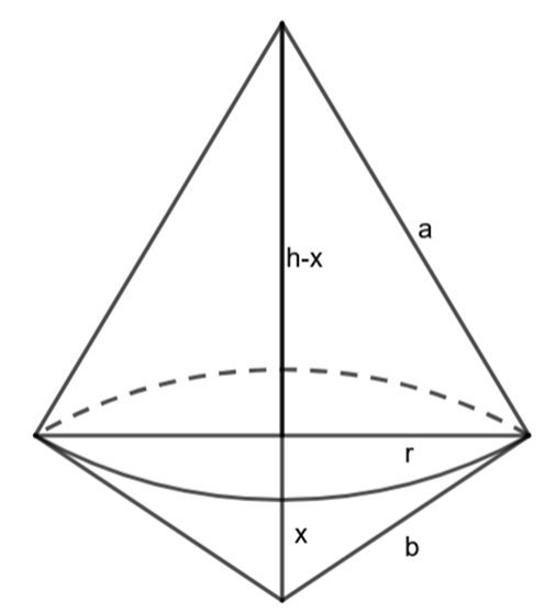 Wyznacz objętość bryły, jeśli dwa stożki mają identyczne podstawy o polu . Stożki te złączono podstawami i otrzymano bryłę przedstawioną na rysunku. Jej przekrojem osiowym jest deltoid o polu 60 cm2.