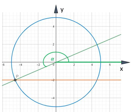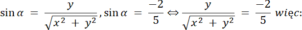 W tym zadaniu skorzystaj ze wzoru na sin α, aby wyznaczyć warunki dla punktu P, przyrównaj liczniki ułamków oraz mianowniki, narysuj odpowiedni wykres i okrąg w układzie współrzędnych. Rozwiązaniem zadania jest tylko jedno miejsce przecięcia osi y = –2 z okręgiem, znajduje się w III ćwiartce układu współrzędnych, ponieważ α ⋲ (180°, 270°).