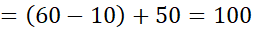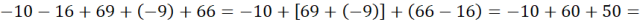 Zapisz w jednym nawiasie sumę liczb 69 i (–9), a w drugim różnicę 66 i 16. Wykonaj działania w nawiasach, a następnie odejmij od liczby 60 liczbę 10, a do wyniku dodaj 50.