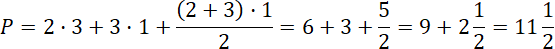 Zauważ, podane wymiary tworzą prostokąt, który zajmuje centralną część figury, zostawiając dwa pasy na górze i na dole, należy więc do niego dodać pole prostokąta o wymiarach 1 na 3 kratki i trapezu prostokątnego o podstawach długości 2 i 3 kratki oraz wysokości równej 1 kratkę. Pamiętaj, pole prostokąta to iloczyn jego długości i szerokości, a pole trapezu to połowa iloczynu jego wysokości i sumy długości jego podstaw. Dodaj do siebie otrzymane wartości, by poznać powierzchnię narysowanej figury.