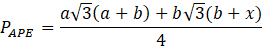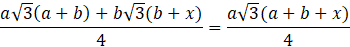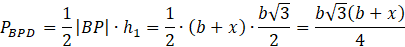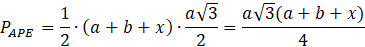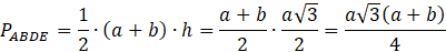 Następnie zapisz pole trójkąta APE jako sumę pól czworokąta ABDE i trójkąta BPD. Czworokąt ABDE jest trapezem (ponieważ odcinki BD i AE są równoległe), którego postawy mają długości a i b, natomiast wysokość jest wysokością trójkąta równobocznego o boku a. Zapisz wzór na pole trapezu. Pole trójkąta BPD oblicz jako połowę iloczynu podstawy BP i wysokości trójkąta równobocznego o boku b.