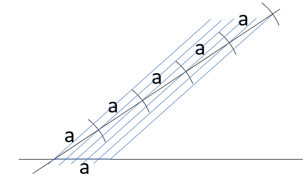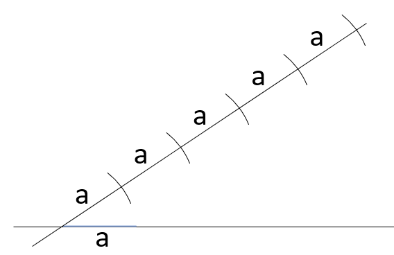 Na narysowanej prostej odłóż pięć odcinków o jednakowej długości, z których pierwszy ma początek w punkcie przecięcia prostych, drugi ma początek w końcu pierwszego itd.
