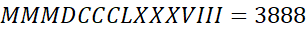 Teraz znajdź liczbę czterocyfrową w zapisie dziesiątkowym, która ma najwięcej znaków w zapisie rzymskim. Najwięcej znaków mają liczby, w których występują trzy takie same cyfry rzymskie. Będą to składniki 3000, 800, 80 i 8.