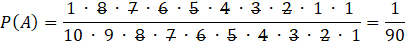 nA = 1 ∙ 8 ∙ 7 ∙ 6 ∙ 5 ∙ 4 ∙ 3 ∙ 2 ∙ 1 ∙ 1 = 1
