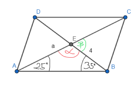 Dany jest równoległobok, którego pole wynosi 24, a krótsza przekątna ma długość 4. Wiadomo również, że dłuższa przekątna tworzy kąty 25° i 35° z jednym z boków. Oblicz długość tej dłuższej przekątnej.