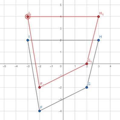 Narysuj na wykresie daną figurę, używając odpowiednich punktów w układzie współrzędnych. Następnie narysuj drugą figurę, której wierzchołki będą znajdować się w innych punktach, a figura będzie przystawać do pierwszej. Czworokąt o wierzchołkach F=(-2,-4), G=(2,-2), H=(3,2), I=(-3,2).