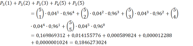 Wyznacz prawdopodobieństwo tego, że co najmniej raz wylosujemy piłkę wadliwą, jeśli w pewnej partii piłek 4% piłek jest wadliwych. Losujemy pięć razy ze zwracaniem jedną piłkę i badamy jej jakość.