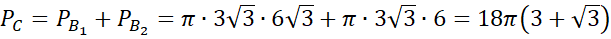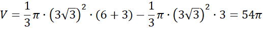 Następnie na podstawie twierdzenia Pitagorasa wyznacz długość tworzącej stożka, a następnie oblicz objętość powstałej bryły, czyli różnicę dwóch stożków o wyznaczonych długościach promieni i wysokościach, a następnie pole całkowite, czyli sumę pól bocznych obu stożków.