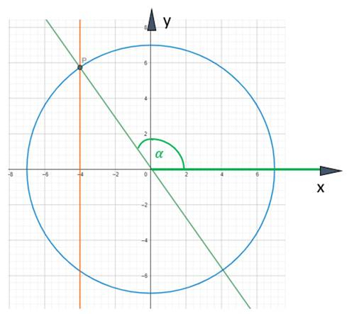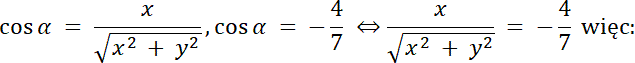 W tym zadaniu skorzystaj ze wzoru na cos α, aby wyznaczyć warunki dla punktu P, przyrównaj liczniki ułamków oraz mianowniki, narysuj odpowiedni wykres i okrąg w układzie współrzędnych. Rozwiązaniem zadania jest tylko jedno miejsce przecięcia osi x = –4 z okręgiem, znajduje się w II ćwiartce układu współrzędnych, ponieważ α ⋲ (90°, 180°).