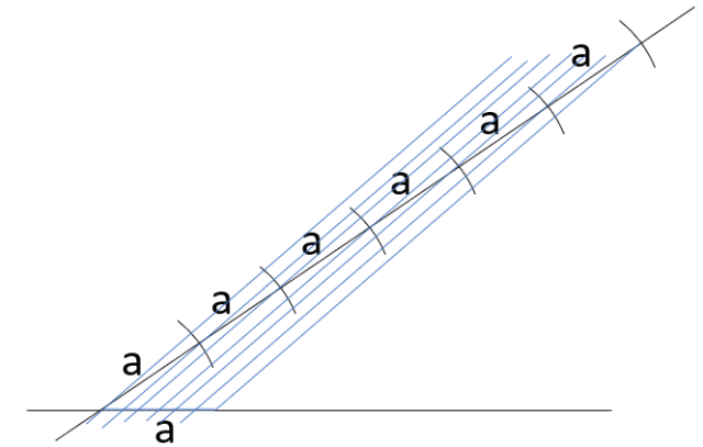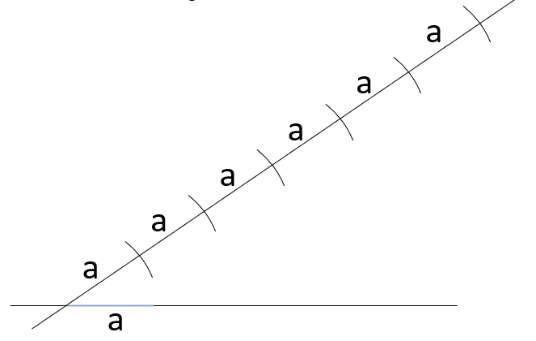 Na narysowanej prostej odłóż sześć odcinków o jednakowej długości, z których pierwszy ma początek w punkcie przecięcia prostych, drugi ma początek w końcu pierwszego itd.