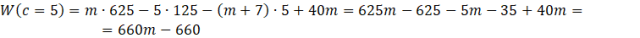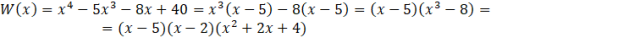 Aby liczba c była pierwiastkiem wielomianu W(x), wielomian musi przyjmować dla niej wartość 0. Aby tak było, podstaw wartość c = 5 do wzoru wielomianu, który następnie przyrównaj do 0. Z otrzymanego równania oblicz wartość zmiennej m, którą podstaw do wzoru W(x). Przekształć wielomian W(x) do postaci iloczynowej przez wyłączenie przed nawias czynnika x – 5, a następnie korzystając ze wzoru skróconego mnożenia na różnicę sześcianów.