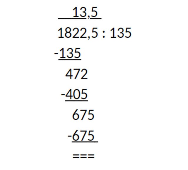 Pamiętaj, iloraz dwóch liczb o tym samym znaku jest liczbą dodatnią. Przesuń przecinki w prawo tak, aby dzielnik był liczbą całkowitą i zapisz te liczby obok siebie. Zapisz, ile razy w liczbie 182 mieści się cała liczba 135, a następnie odejmij od niej iloczyn liczby 135 i wpisanej liczby. Dopisz na końcu wyliczonej różnicy kolejną cyfrę z dzielnej i postępuj identycznie z otrzymanymi wynikami, aż do końca liczby. Przepisz przecinek w tym samym miejscu, w którym stał w dzielnej.