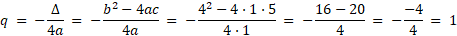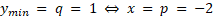 Zauważmy, że współczynnik a jest dodatni, więc ramiona są skierowane w górę, a co za tym idzie, nie istnieje wartość największa, a wartość najmniejsza jest równa drugiej współrzędnej wierzchołka q, przyjmowane dla argumentu, będącego jego pierwszą współrzędną p.