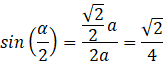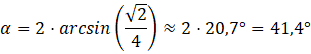 Oblicz długości boków trójkąta utworzonego przez zaznaczone odcinki. Wykorzystaj równoramienność powstałego trójkąta, by obliczyć miarę kąta α. Skorzystaj z tablic wartości funkcji trygonometrycznych lub kalkulatora.