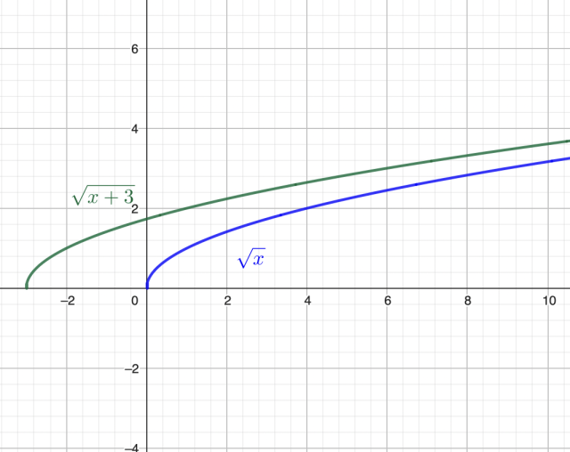 Aby narysować wykres funkcji g, przesuń wykres funkcji f o 3 jednostki w lewo, wzdłuż osi OX, zauważ, że dziedzina funkcji g zmaleje o 3 jednostki: