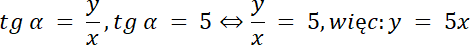 W tym zadaniu skorzystaj ze wzoru na tg α, aby wyznaczyć warunki dla punktu P, przyrównaj liczniki ułamków oraz mianowniki, a następnie narysuj prostą o równaniu y = 5x w układzie współrzędnych i zaznacz na niej punkt P, gdzie pierwsze ramię leży na dodatniej osi OX, a drugie odpowiednio dla punktu P, czyli w III ćwiartce układu współrzędnych, ponieważ α ⋲ (180°, 360°).