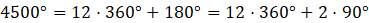 Miara kąta jest dodatnia, zatem wiadomo, że końcowe ramię zostało obrócone o 4500° w kierunku przeciwnym do ruchu wskazówek zegara.